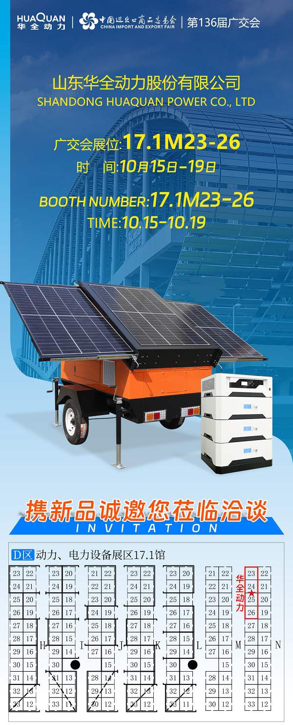 From October 15th to 19th, the 136th Canton Fair (2024 China Import and Export Fair) will be grandly launched at the Canton Fair Complex in Guangzhou. As a global provider of power products and solutions, Huaquan Power will bring new equipment and products to the exhibition, booth number 17.1M23-26, welcome new and old customers and colleagues to visit the booth to negotiate.